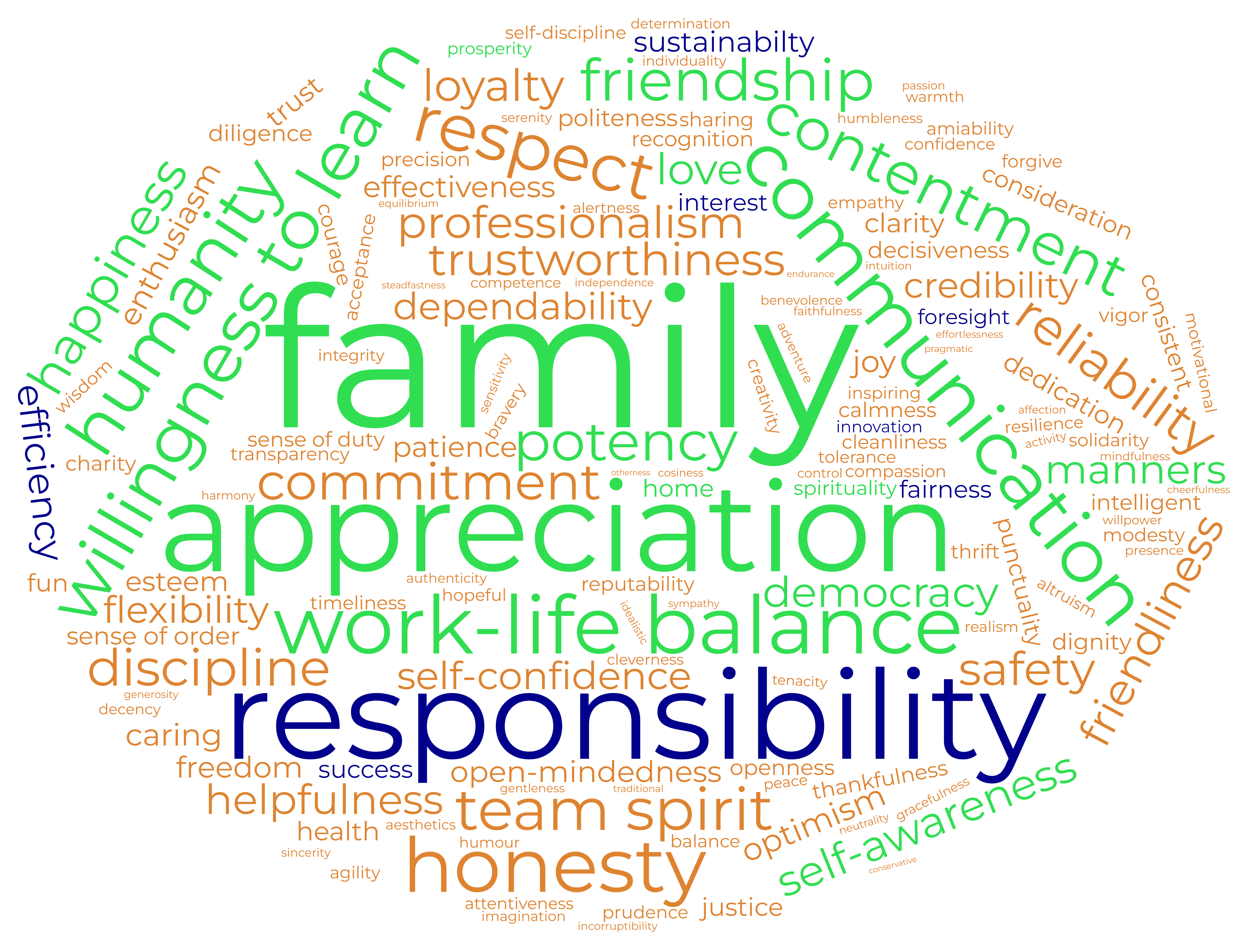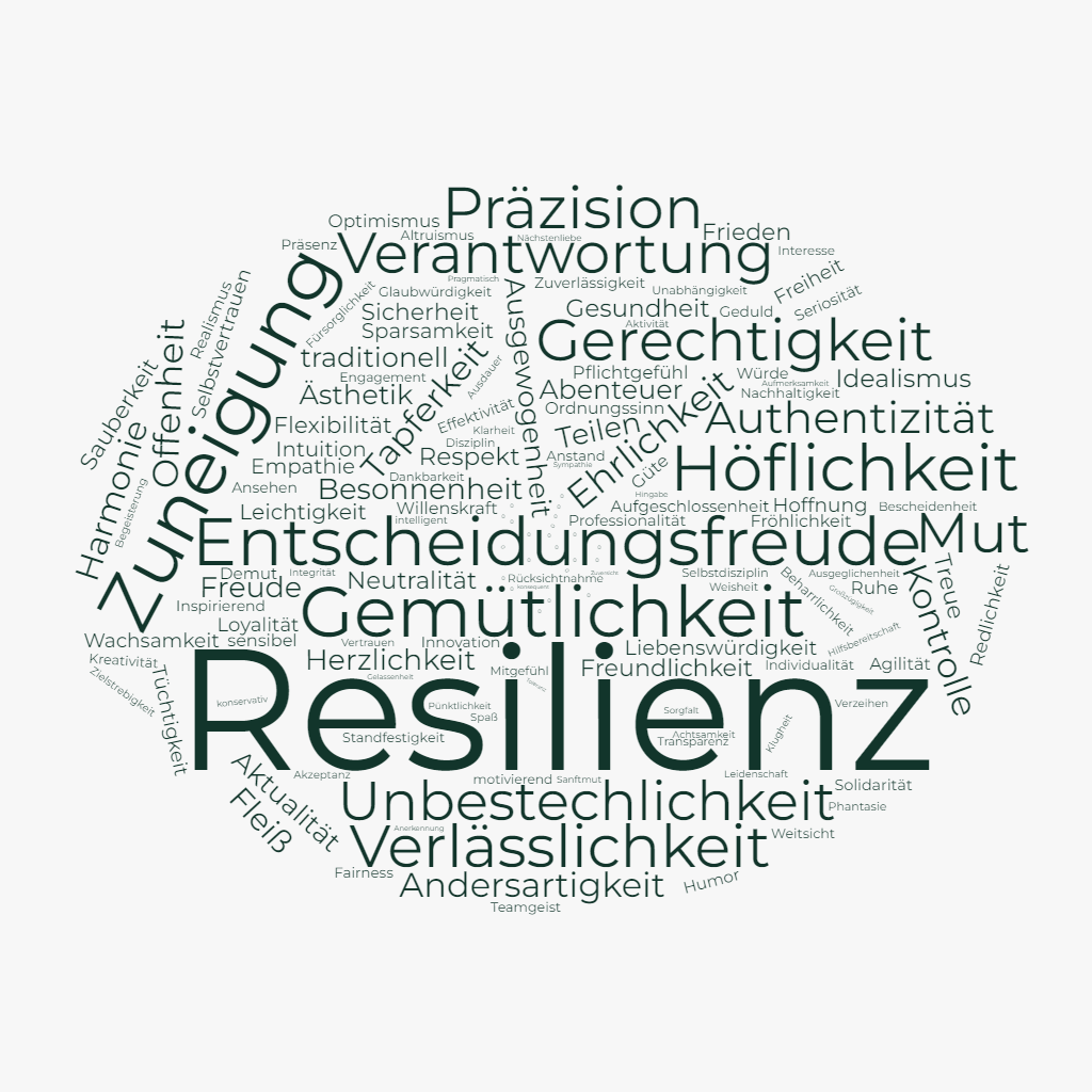 Als Ergebnis erhalten wir eine Auswertung, die mindestens als Wortwolke (mit Ranking) der einzelnen genannten Wertebegriffe dargestellt wird. Diese Wortwolke zeigt eindeutig und für jeden ersichtlich das WIR auf – also die Antwort auf die Fragen: „Wer sind wir, was macht uns aus, was ist uns besonders wichtig. Und was ist demnach die Basis für ein WIR-Gefühl, das aus Gemeinsamkeiten und individuellen Werten besteht?“