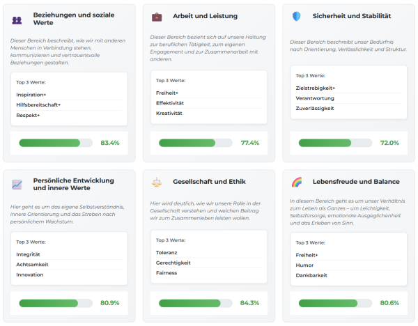 Die 6 Lebensbereiche mit den jeweils drei wichtigsten Werten und wie stark ein Lebensbereich in dessen Bedeutung und Entwicklung ausgeprägt ist:
