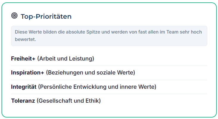 - Werte, die euch entsprechen und ihr möglicherweise noch nicht auf dem Schirm hattet – als Rankings und visuelle Auswertungen.